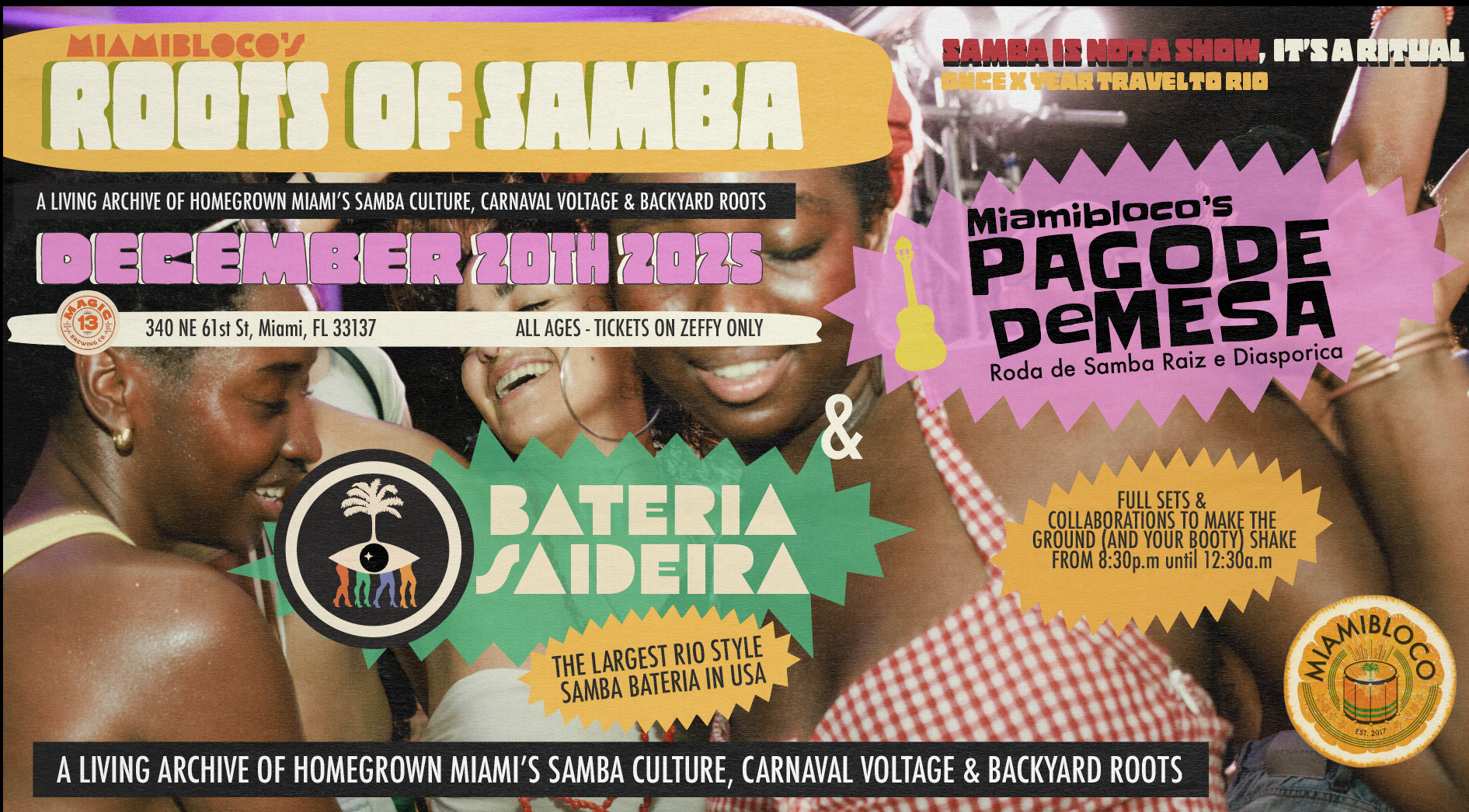 This commitment comes into sharp focus each December during ROOTS OF SAMBA: A LIVING ARCHIVE OF HOMEGROWN MIAMI’S SAMBA CULTURE, CARNAVAL VOLTAGE & BACKYARD ROOTS. These gatherings are where we trace the through-line from Angola to Bahia to Rio to Miami, and invite our community to feel that history in our bodies together. ROOTS OF SAMBA is as much about memory and repair as it is about spectacle, a space where drums, voices, and stories archive what this city’s Black and Afro-diasporic communities are creating right now.